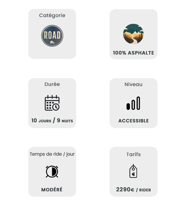 Partez à la découverte de 5 pays européens en explorant les magnifiques régions situées autour du Tyrol, le véritable cœur des Alpes. Vous roulez sur des magnifiques routes de montagne, entourées d’un paysage à couper le souffle. Admirez des panoramas alpins époustouflants, allant des sommets enneigés aux vallées verdoyantes, des lacs cristallins aux rivières tumultueuses. Vous franchirez certains des cols les plus spectaculaires et les plus élevés d’Europe, tels que le célèbre col du Stelvio, avec ses lacets légendaires, ou encore le majestueux col du Furka, entouré de glaciers d’un bleu polaire.